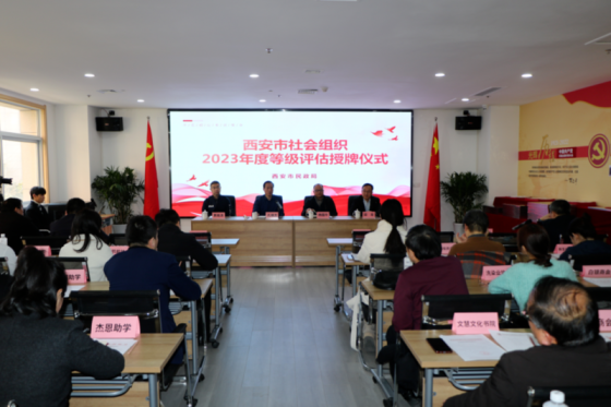 1月26日下午,市民政局举行西安市社会组织2023年度等级评估授牌仪式,为新评估的3A级以上社会组织颁发荣誉证书和牌匾。市民政局党组成员、副局长孔维龙出席会议并讲话。市民政局、市体育局相关处室负责同志,受评的社会组织负责人等70余人参加会议。经资格审核、组织自评、实地考察、评估专家组的复核和审定,共评选出33家3A级以上社会组织。其中,5A级社会组织6家、4A级社会组织10家、3A级社会组织17家。西安市扶风商会获评“4A级社会组织”。